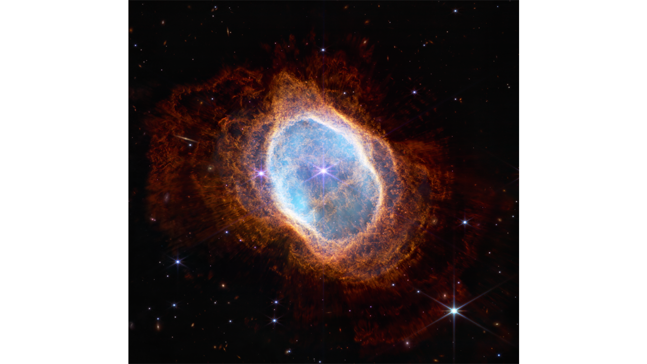 Outra nebulosa estudada foi a Nebulosa do Anel Sul, mais uma belíssima imagem que chega em nossas mãos. Identificada como NGC 3132, essa nebulosa planetária é uma extensa nuvem de gás circunscrevendo uma estrela anã branca moribunda (COELHO, 2022). Nebulosas planetárias correspondem ao estágio final do ciclo de vida de uma estrela de massa mediana. Quando esse tipo de estrela atinge essa fase, um processo de fusão de hidrogênio em hélio ocorre em seu núcleo e o gás hélio superaquecido e comprimido dá origem a átomos de carbono e, às vezes, oxigênio. Em seguida, há a perda da massa da estrela através da ejeção de suas camadas mais externas por ventos estelares. O restante da estrela emite um pico de radiação ultravioleta que ioniza o gás que a rodeia, dando a ela as cores que tanto deslumbram os nosso olhos (ZAMPA, 2018). É isso que vemos na imagem abaixo.